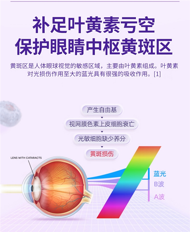 A:有用。叶黄素可减少蓝光对眼表的刺激,搭配蓝莓花青素、维生素B族,能缓解眼干、眼涩症状,但需配合人工泪液(遵医嘱),效果更佳。